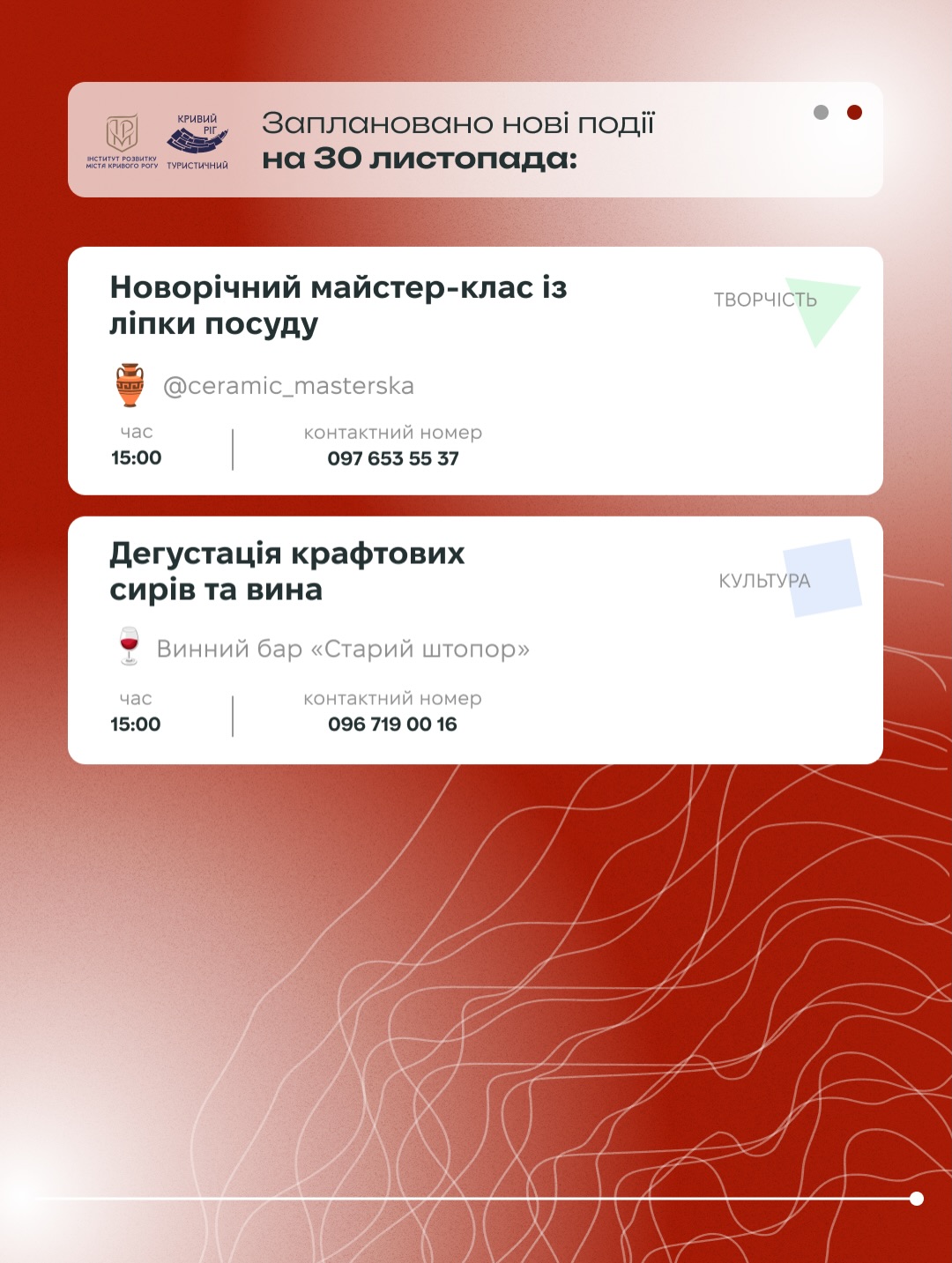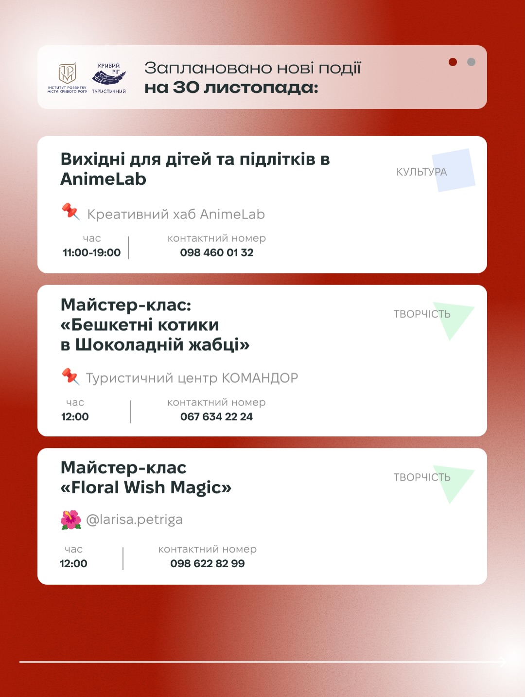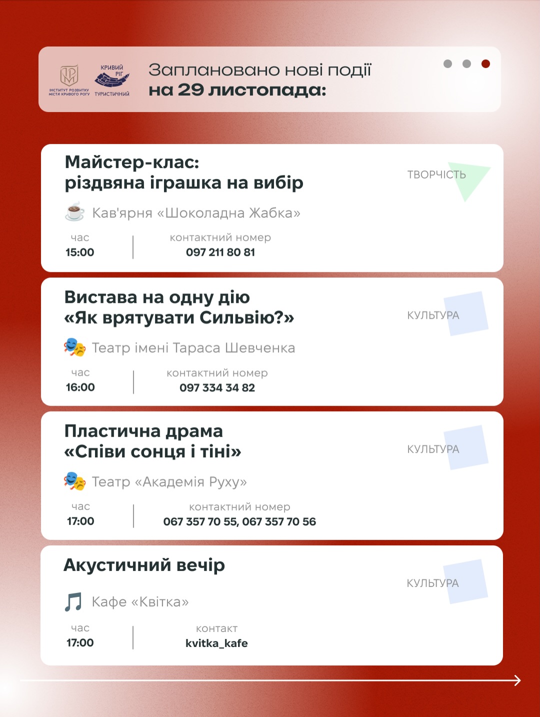 Ці вихідні обіцяють стати маленькою паузою посеред метушні - тією, що повертає дихання і дарує відчуття тепла. 🍁Осінь ще тримається за останні барви, ніби хоче сказати: «Зупинись і подивись». Саме час пройтися містом без поспіху, знайти нову улюблену кав’ярню, відвідати подію, яка давно чекала у списку, або просто впустити у своє життя трохи краси. ☕️ Можливо, це буде мистецька зустріч, несподіване відкриття, вечір музики чи коротка подорож, що подарує нові думки. Нехай ці дні стануть моментом, коли ти дозволиш собі більше світла, натхнення і тиші, з якої народжуються нові сили. Обирай те, що відгукується саме тобі - і нехай вихідні стануть теплими, живими та справжніми.🤍