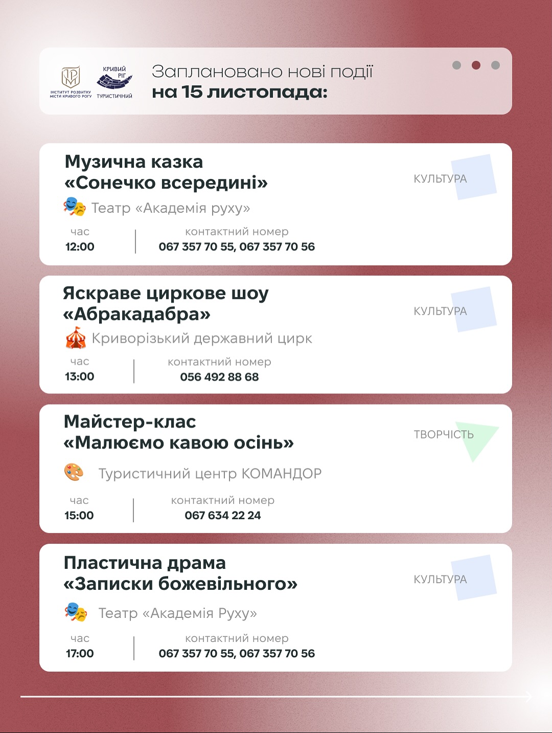 🎶 Мистецтво: театральні вистави, концерти, циркове шоу та музичні перформанси.